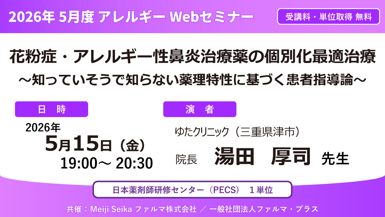 ●先着3,000名 【無料・PECS1単位】2026年5月度 アレルギーWebセミナー「花粉症・アレルギー性鼻炎治療薬の個別化最適治療 ~知っていそうで知らない薬理特性に基づく患者指導論~」
