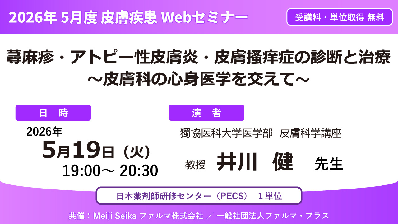 ●先着3,000名【無料・PECS1単位】2026年5月度 皮膚疾患Webセミナー「蕁麻疹・アトピー性皮膚炎・皮膚搔痒症の診断と治療 ~皮膚科の心身医学を交えて~」