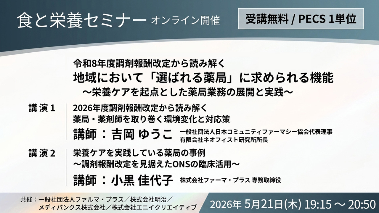 【受講無料】令和8年度調剤報酬改定から読み解く 地域において「選ばれる薬局」に求められる機能 ~栄養ケアを起点とした薬局業務の展開と実践~【PECS 1単位】